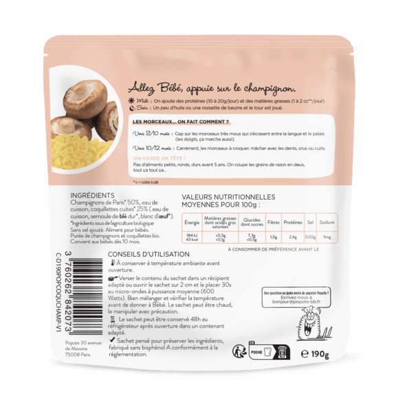 Champignons de Paris* 50%, eau de cuisson, coquillettes cuites* 25% (eau de