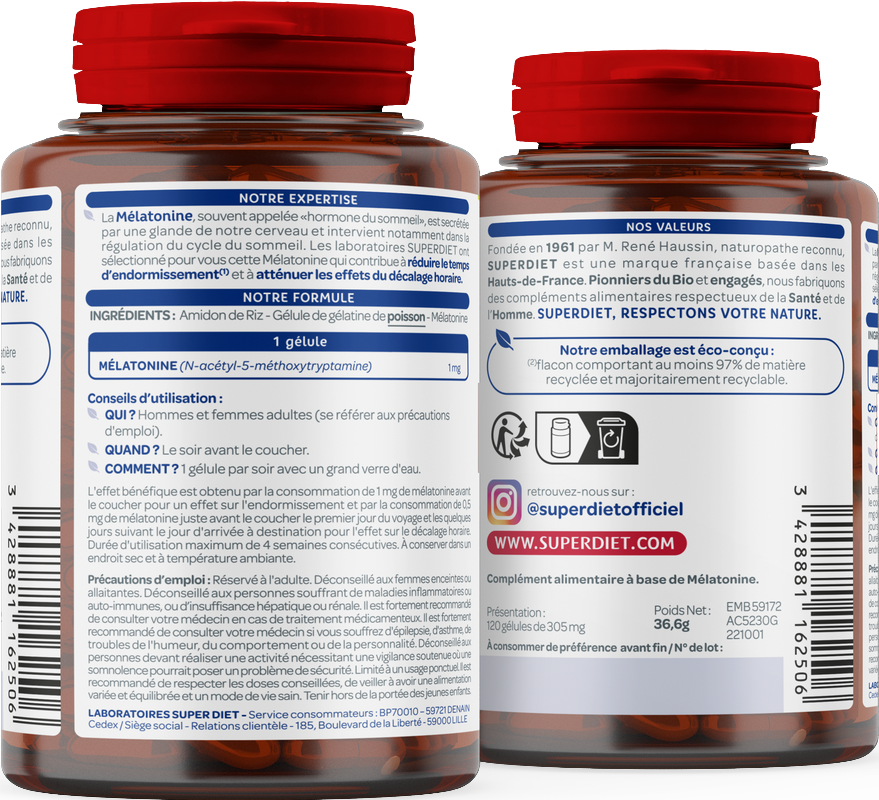 La Mélatonine, souvent appelé hormone du sommeil, est secrétée naturellement par votre cerveau et intervient notamment dans la régulation du cycle du sommeil.
