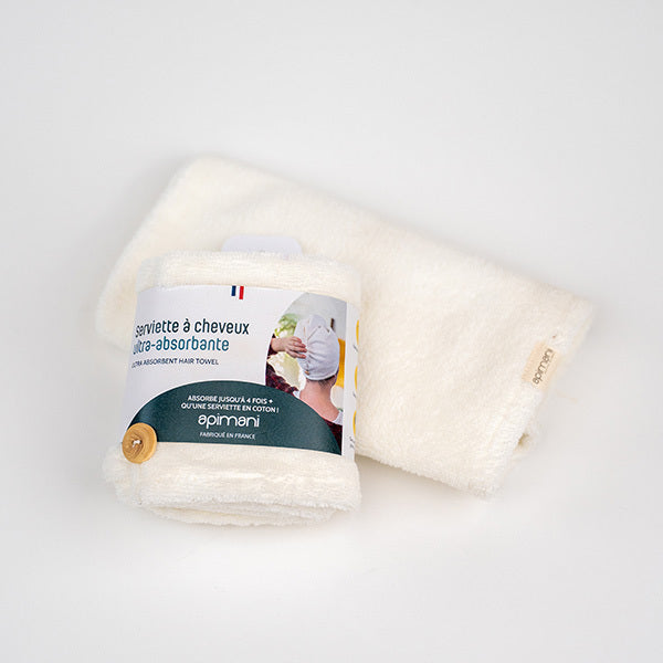 Fabriquée en France, à partir de viscose de bambou revalorisée – un tissu sauvé du gaspillage pour lui donner une nouvelle vie – notre serviette à cheveux allie anti-gaspi, confort et efficacité.